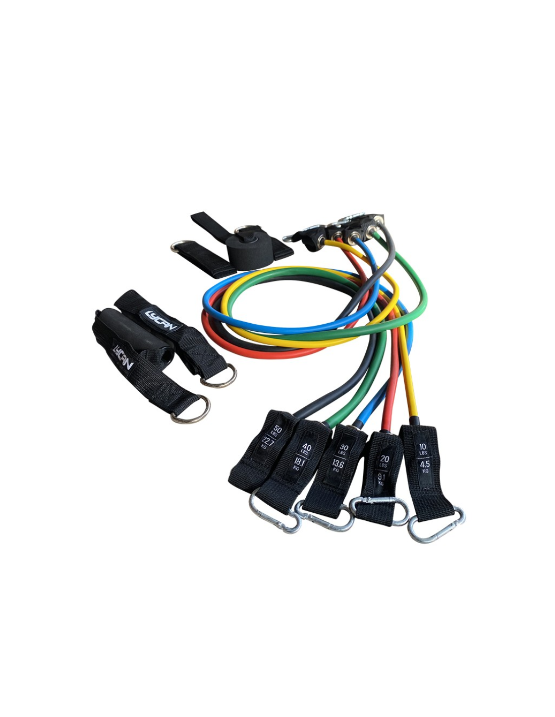 Incluye: 5 bandas de resistencia, 2 asas amortiguadas, 1 bolsa de almacenamiento, 1 ancla para puerta y 2 correas para tobillo.