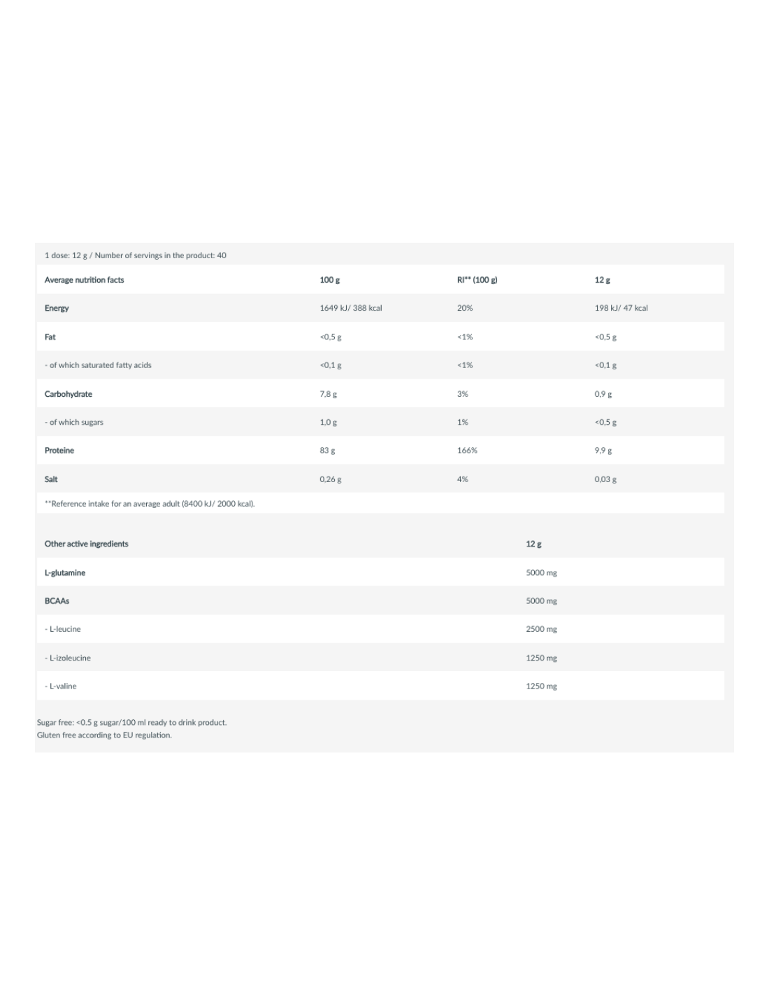 L-glutamina 42 %, L-leucina instantánea 21 % (L-leucina, emulsionante: lecitinas, maltodextrina), L-isoleucina 10,4 %, L-valina 10,4 %, aromatizantes, acidulante (ácido cítrico), edulcorante (sucralosa), sal, colorante (tartrazina**).